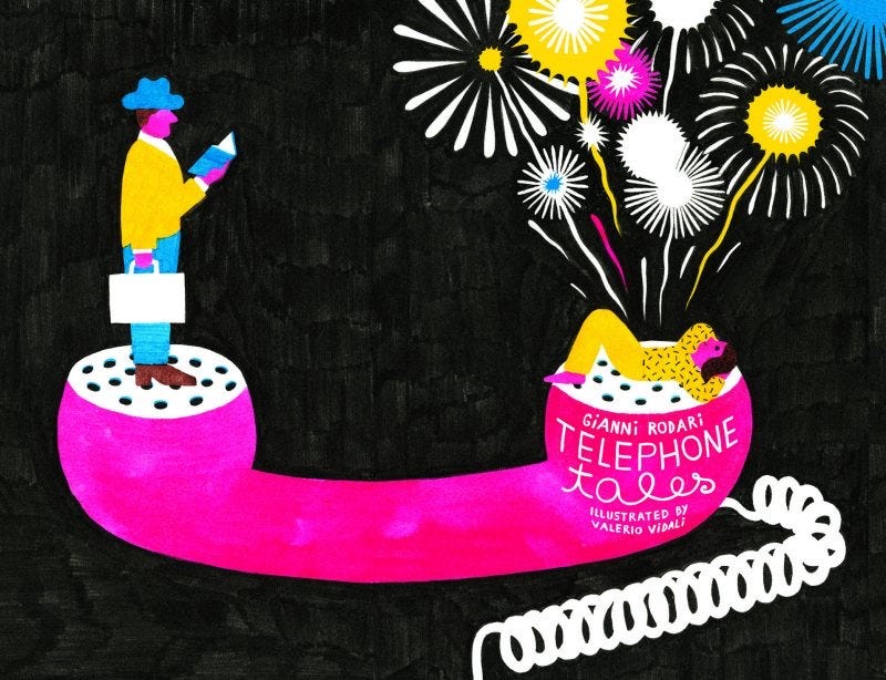Gracias a la niña de las gafas de sol llegué a Gianni Rodari, un escritor que enseña a leer, que no es lo que ustedes creen que significa leer. Busquen, por ejemplo, Cuentos por Teléfono (en inglés Telephone Tales). El libro tiene una premisa muy simple: todas las noches, a las 9pm, un padre que viaja mucho debe llamar a su hija y contarle por teléfono un cuento para que ella se pueda dormir. Lo hace desde una cabina telefónica y, como suele andar corto de monedas, solo tiene dos o tres minutos para contar cada historia. Los cuentos de este libro de 1962 hablan como los niños cuando se les toma en serio: son a la vez un acertijo, una broma, una máxima filosófica y una forma de la belleza; son livianos e inagotables, como los juegos, los que de verdad nos divierten y por eso jugamos en serio. Si necesitas una prueba, aquí puedes leer unos cuantos, idealmente antes de dormir.